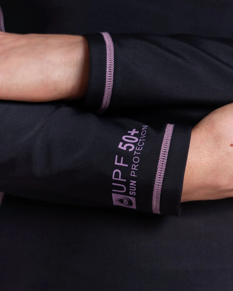 Das Rashvest ist in einem eleganten Schwarz gehalten, das durch pinke Kontrastnähte ergänzt wird.