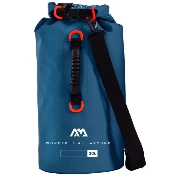 Тъмносинята водонепропусклива чанта Aqua Marina 20L е идеална за пренасяне и защита на лични вещи и устройства по време на водни спортове.
